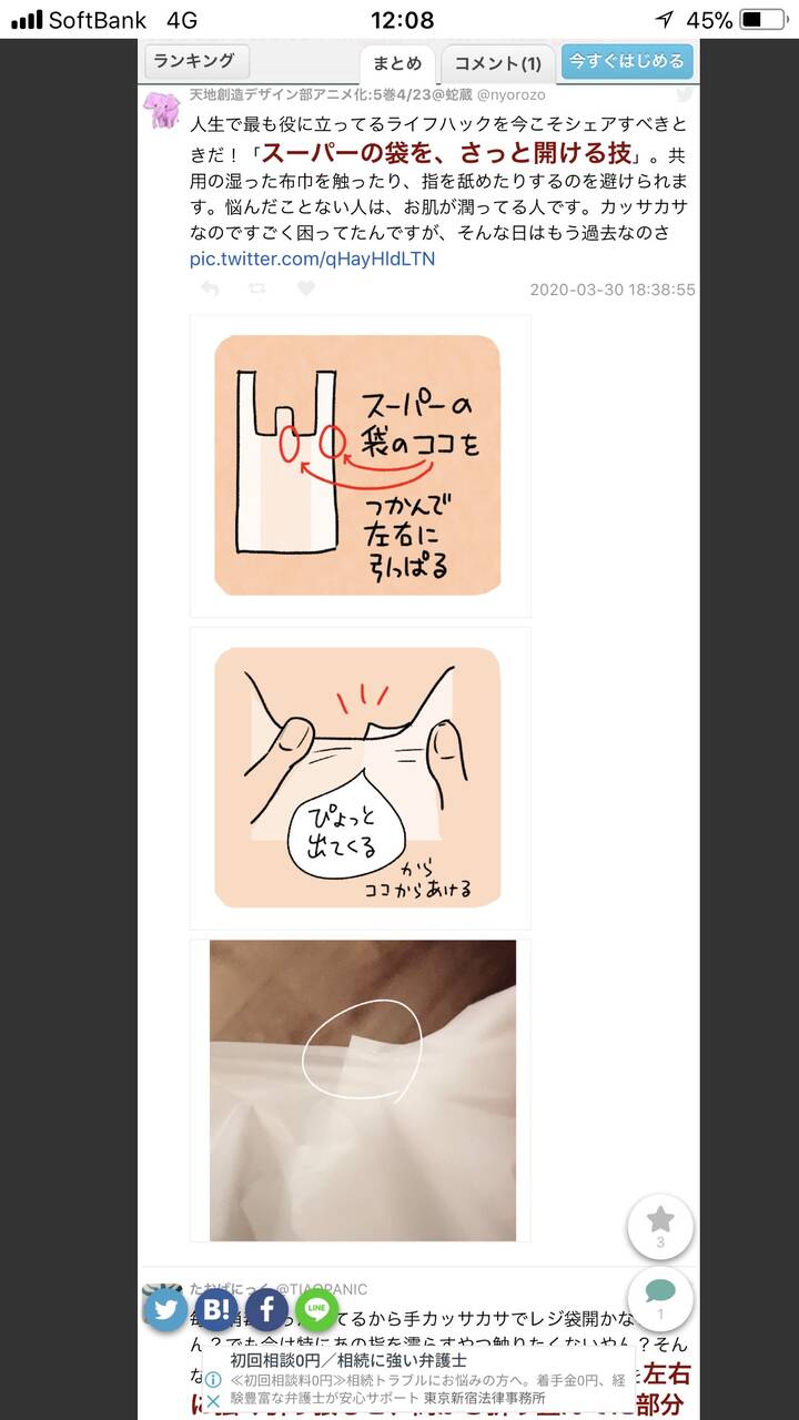 人生で最も役に立ってるライフハックを今こそシェアすべきときだ!「スーパーの袋を、さっと開ける技」。共用の湿った布巾を触ったり、指を舐めたりするのを避けられます。悩んだことない人は、お肌が潤ってる人です。カッサカサなのですごく困ってたんですが、そんな日はもう過去なのさ pic.twitter.com/qHayHldLTN