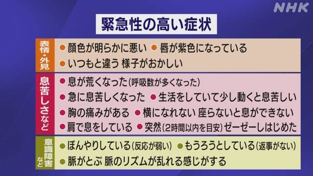「唇が紫色になっている」「座らないと息ができない」など、重症化の前兆となる緊急性の高い症状を