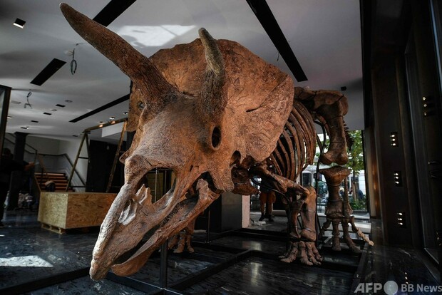 【AFP=時事】これまで発掘された草食恐竜トリケラトプスの化石で最大となる骨格標本「ビッグ・ジョン(Big John)」が21日、仏パリで競売に掛けられ、米国の個人収集家により660万ユーロ(約8億7000万円)で落札された。