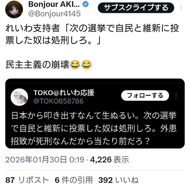 れいわ支持者「次の選挙で自民と維新に投票した奴は処刑しろ。」