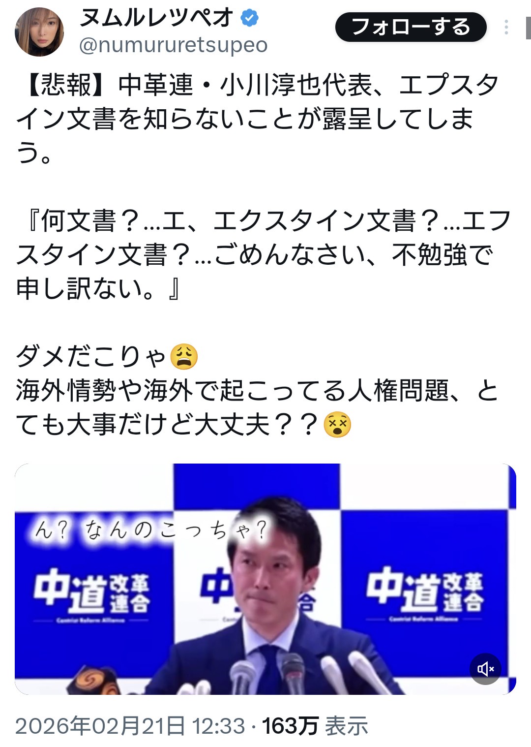 【悲報】中革連・小川淳也代表、エプスタイン文書を知らないことが露呈してしまう。