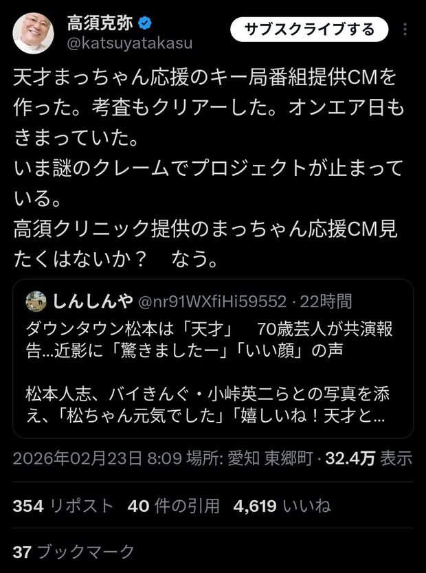 高須クリニック提供のまっちゃん応援CM見たくはないか? なう。 https://t.co/WOG5jfjc91— 高須克弥 (@katsuyatakasu) February 22, 2026