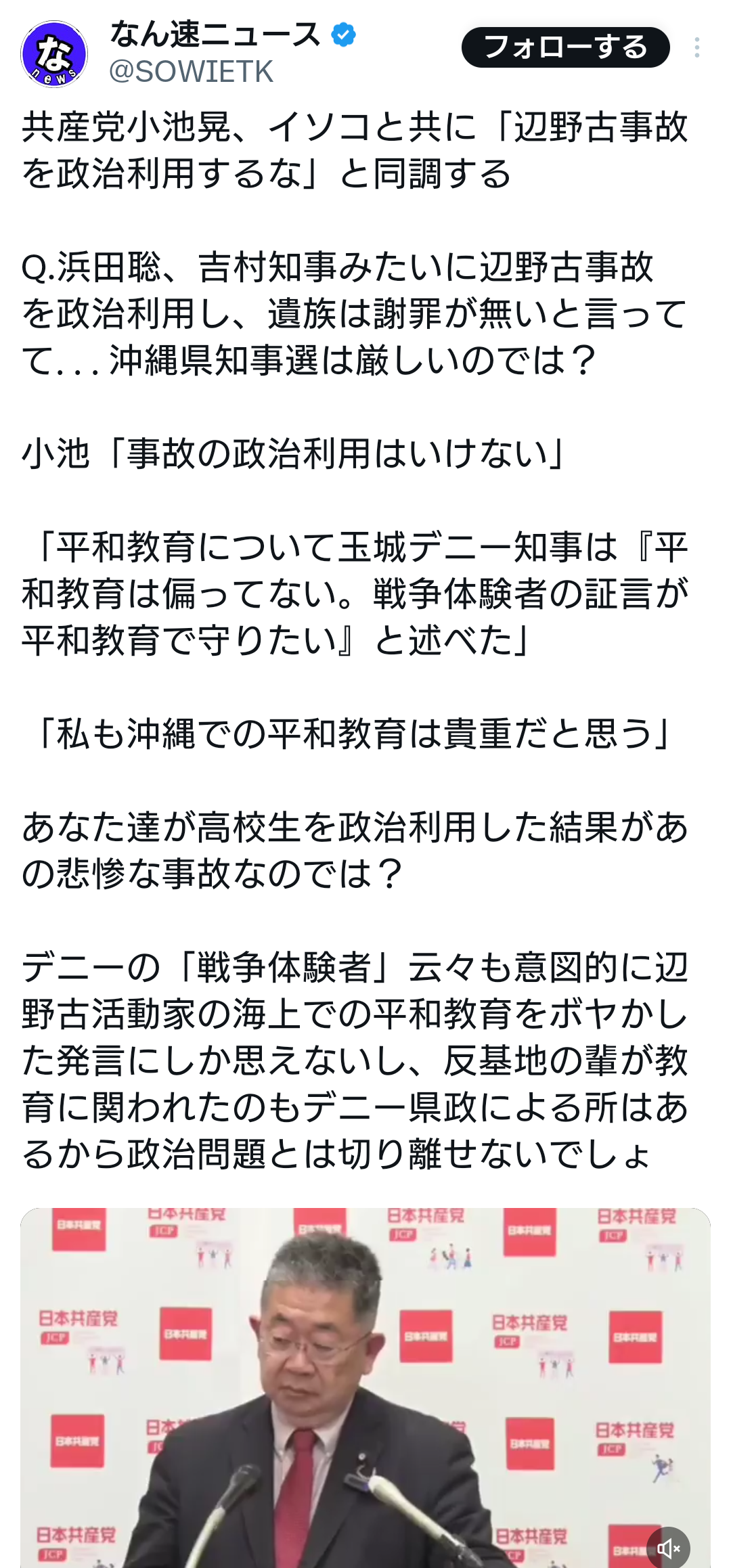 共産党小池晃、イソコと共に「辺野古事故を政治利用するな」と同調する