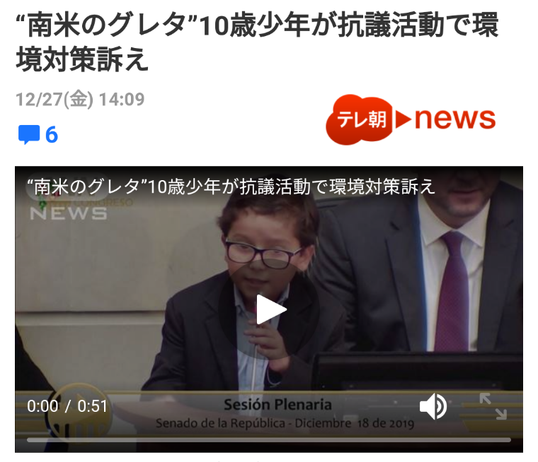 https://headlines.yahoo.co.jp/videonews/ann?a=20191227-00000038-ann-int南米コロンビアで10歳の少年が環境問題に関する抗議活動に参加し、地元で「南米のグレタ」として話題となっています。
