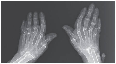 レントゲン写真に映し出された両手の骨は、破壊がかなり進んでいて、すべての指の第二関節が本来の位置からずれて脱臼しており、指の曲げ伸ばしができない状態だった。