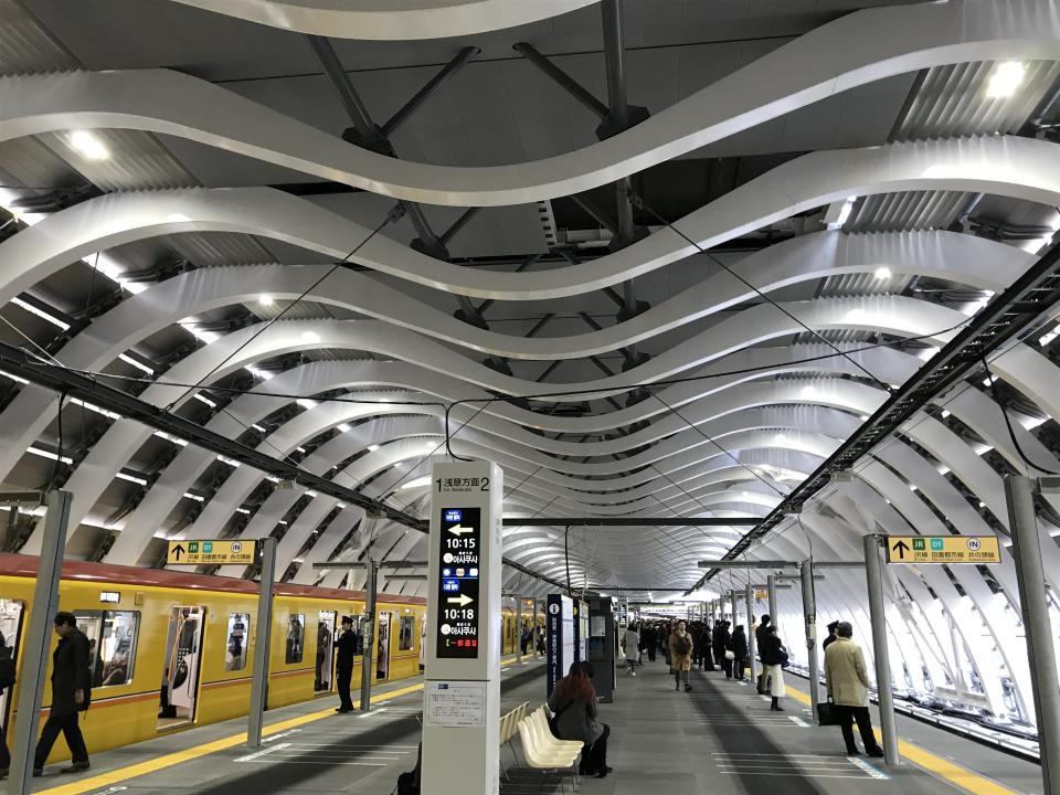 年末年始にかけて移設工事を行っていた東京メトロ銀座線・渋谷駅。2020年1月3日、ついに新駅舎がオープンし、列車の運行が始まった。ピカピカの駅舎内でひときわ注目を集めているのが、このM字型の屋根だ。