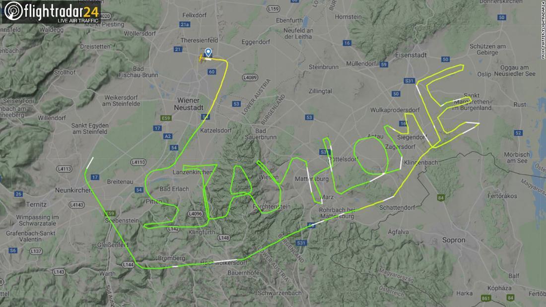 (CNN) オーストリア上空でこのほど、新型コロナウイルスの流行中は自宅にとどまってほしいとのメッセージを込め、操縦士が航跡で「STAY HOME」の文字を描く出来事があった。航空機追跡サイト「フライトレーダー24」が伝えた。パイロットの名前は公表されていない。